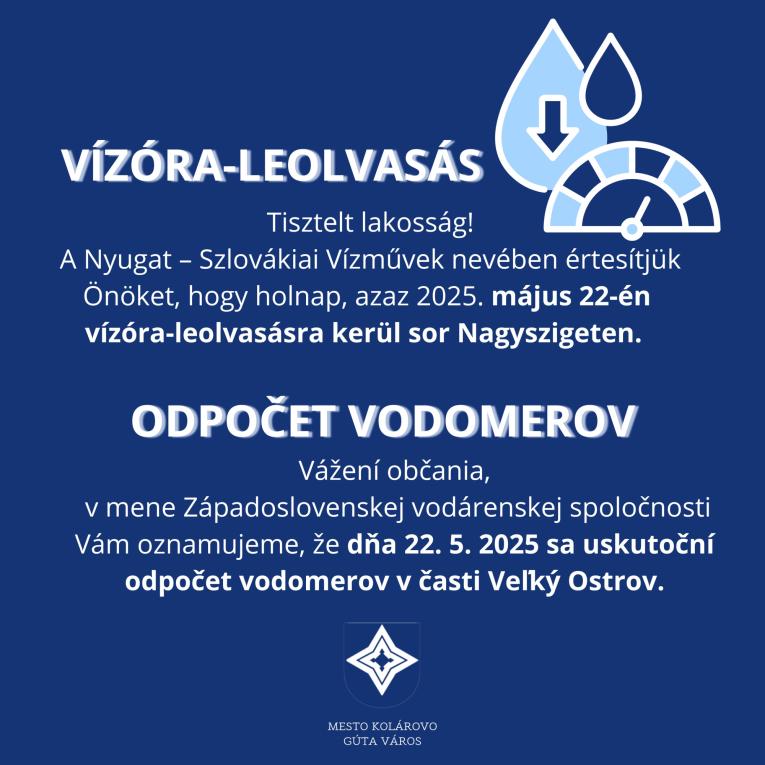 Vážení občania, v mene Západoslovenskej vodárenskej spoločnosti Vám oznamujeme, že dňa 22. 5. 2025 sa uskutoční odpočet vodomerov v časti Veľký Ostrov.