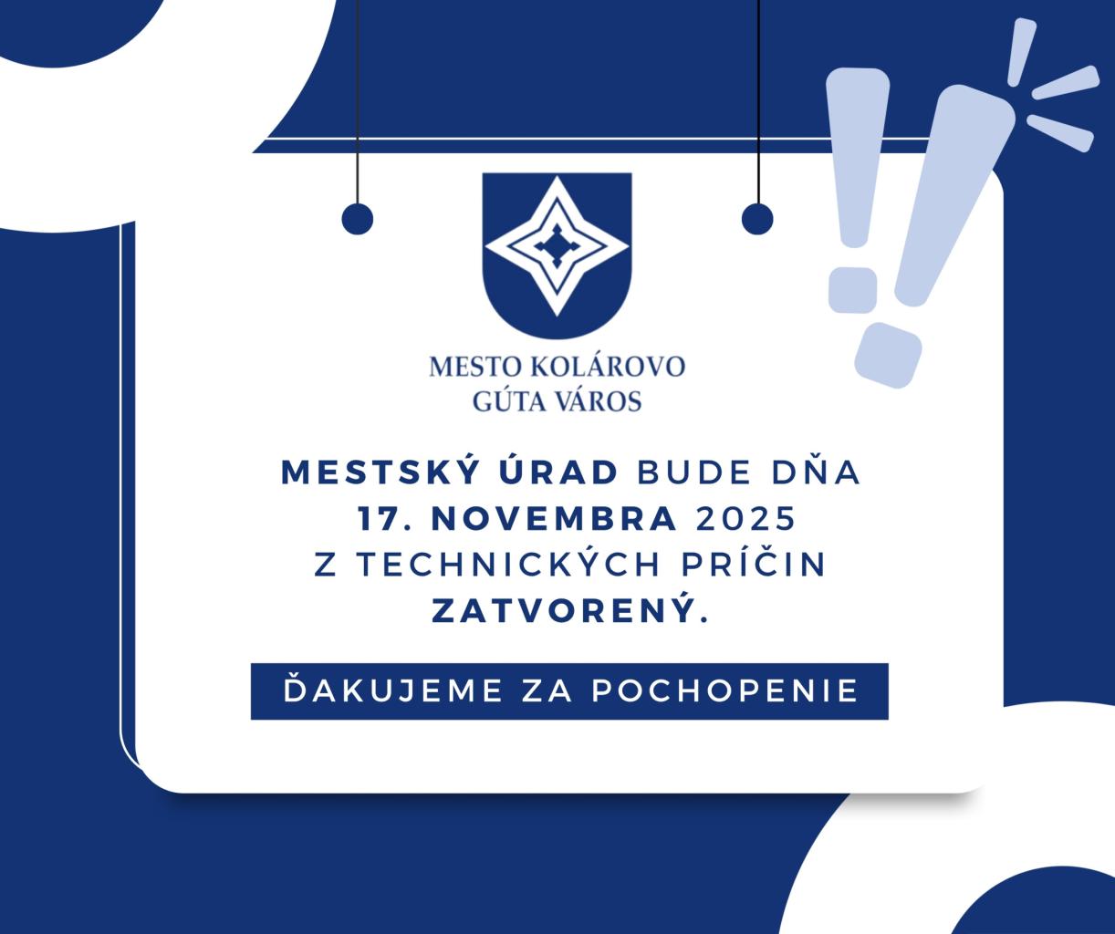 Mestský úrad bude dňa 17. novembra 2025. z technických príčin zatvorený. Ďakujeme za pochopenie.